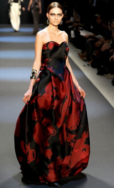 Naeem knows how to show off women’s sensual bodies with dangerous plunges of the décolletage. Swirling gowns were in contrasting colors of scarlet, black, white, and metallics. Floral motifs abounded from the patterns on the fabrics to the gold floral applique on a dress. His Indian background was apparent in the unbelievably intricate crystal beading and embroidery in lush jewel tones.