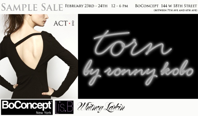 Act 1 by Sally Wu is teaming up with Torn by Ronny Kobo for one fabulous sample sale! This event begins Wed the 23rd and ends Thurs the 24th from 12-6pm both days.