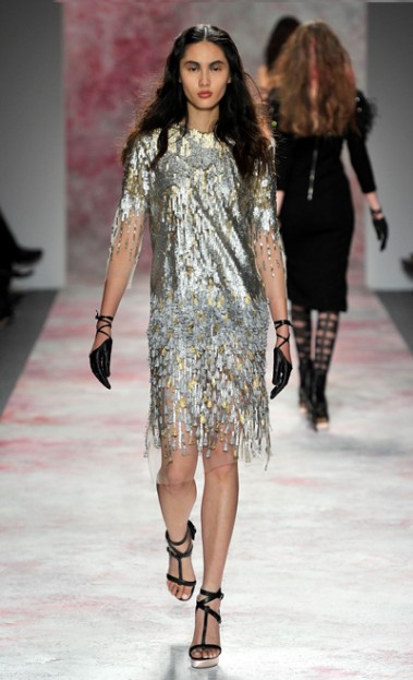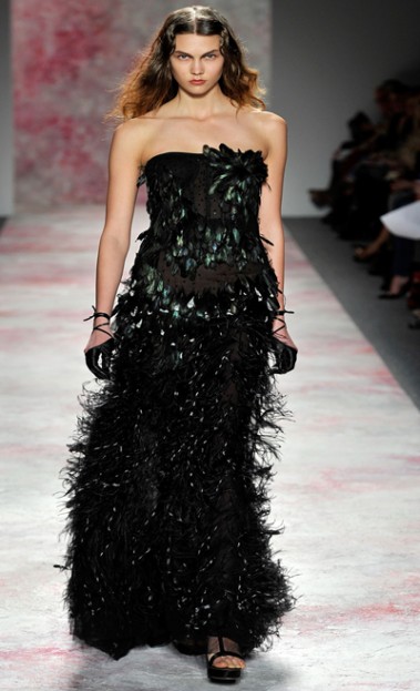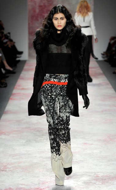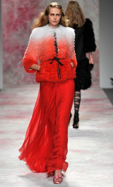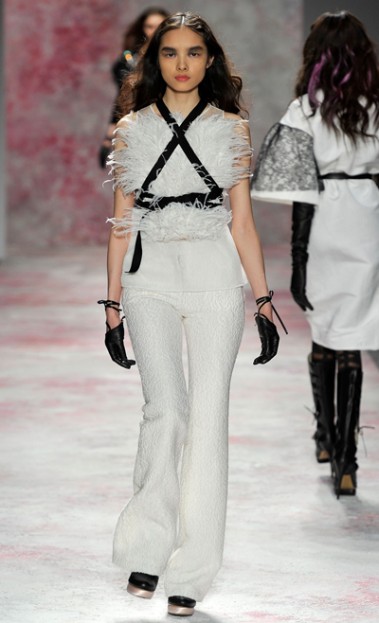 The Singapore-born, Nepal-raised young designer’s inspiration was a younger version of Miss Havisham from Charles Dicken’s Great Expectations, the wealthy spinster who goes mad after her lover jilts her at the altar. Asymmetric one shoulder looks, criss cross wrap leggings, and dramatic red chiffon paired with tough black leather, all painted a romantic portrait of a soul on the verge of madness. I liked the mischievous sheer sectioning of a sweater and the lone leather strap strategically and sensually placed over one shoulder of an asymmetric red dress. I can see why Prabal Gurung’s slightly off kilter yet elegant designs are an editorial favorite.