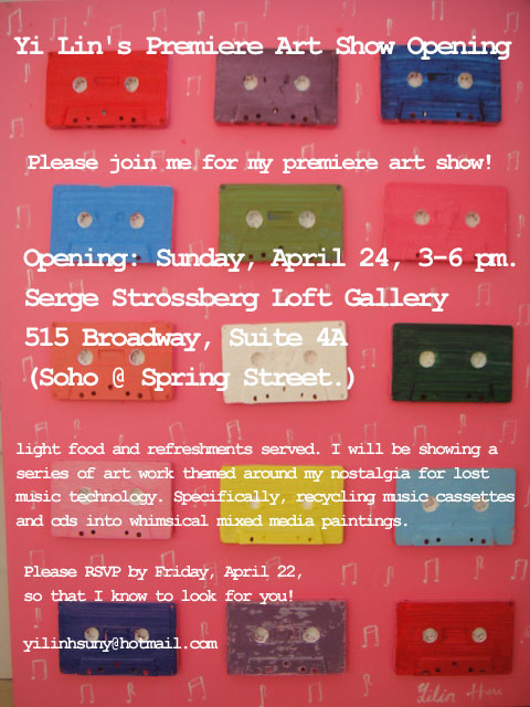 On Sunday, April 24 from 3-6 pm at Serge Strosberg’s Loft Gallery located at 515 Broadway, Suite 4A in Soho.Our AsianInNY good friend Yi Lin will be showing a series of art works themed around my nostalgia for lost music technology. Specifically, recycling music cassettes and cds into whimsical mixed media paintings.