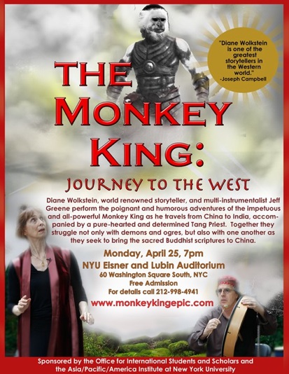 Diane Wolkstein, world renowned storyteller, and multi-instrumentalist Jeff Greene perform the poignant and humorous adventures of the impetuous and all-powerful Monkey King (孫悟空) as the travels from China to India, accompanied by a pure-hearted and determined Tang Priest (唐三藏). Together they struggle not only with demons and ogres, but also with one another as they seek to bring the sacred Buddhist scriptures to China.