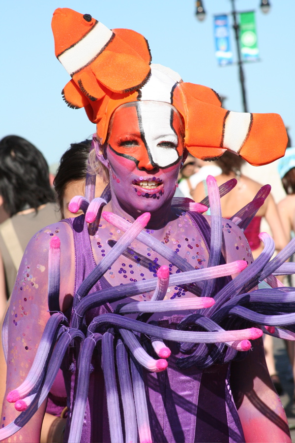 The Mermaid Parade celebrates the sand, the sea, the salt air and the beginning of summer, as well as the history and mythology of Coney Island, Coney Island pride, and artistic self-expression. The Parade is characterized by participants dressed in hand-made costumes as Mermaids, Neptunes, various sea creatures, the occasional wandering lighthouse, Coney Island post card or amusement ride, as well as antique cars, marching bands, drill teams, and the odd yacht pulled on flatbed.