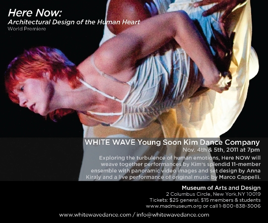 WHITE WAVE Young Soon Kim Dance Company will present the World Premiere of Kim’s Here NOW: Architectural Design of the Human Heart, on November 4th and 5th at 7pm as part of the Performance Series of the Museum of Arts and Design (2 Columbus Circle, Manhattan).