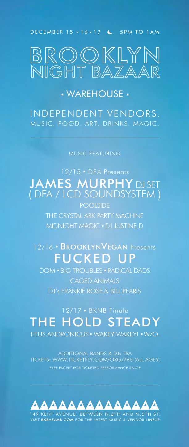 -Live music and DJ sets including James Murphy (LCD Soundsystem), The Crystal Ark, Midnight Magic, The Hold Steady, Titus Andronicus, Wakey!Wakey!, and more. See Ticketfly.com for tickets to the Bazaar’s performance space.