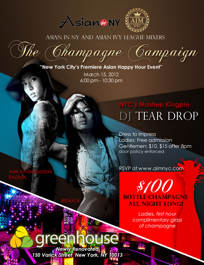 You are cordially invited by AsianInNY to the “Champagne Campaign”, New York City’s Premiere Asian Professionals Happy Hour Event. Complimentary Glass of Champagne for Ladies in the First Hour.