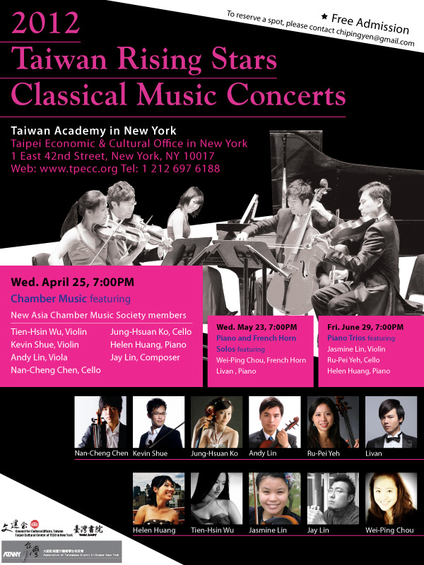 駐紐約臺北文化中心將於2012年4月份起於紐約臺灣書院(紐約市曼哈坦東42街1號)舉辦3場古典音樂會,特別邀請多位旅居美國的台灣傑出古典樂壇新秀舉行室內樂音樂會、鋼琴及法國號雙獨奏會及鋼琴三重奏音樂會,免費入場,歡迎有興趣的民眾預約欣賞。
