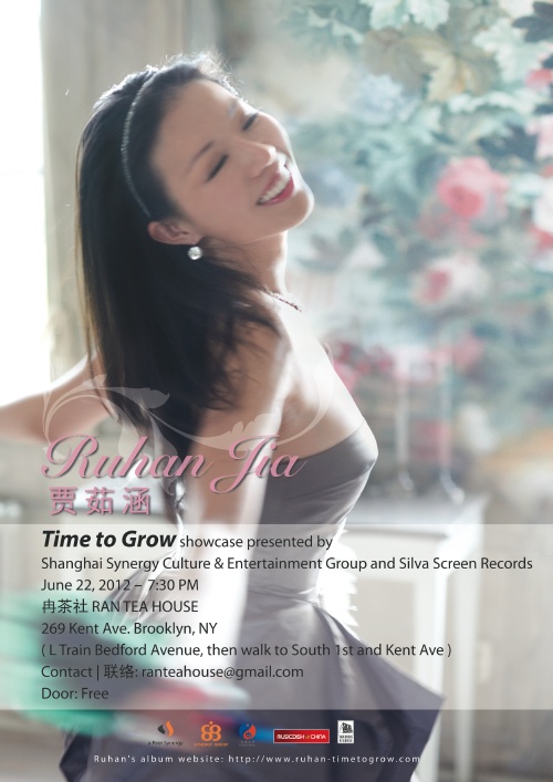 Shanghai Synergy Culture & Entertainment Group (SSCEG) presents a rising star Ruhan Jia at Brooklyn’s Ran Tea House on Friday June 22nd, coinciding with her invitation to A2IM Indie Week 2012 conference. SSCEG will be holding a press conference at the venue starting at 6:30pm, followed by Ruhan’s debut New York performance where she will introduce songs from her debut album “Time to Grow”.