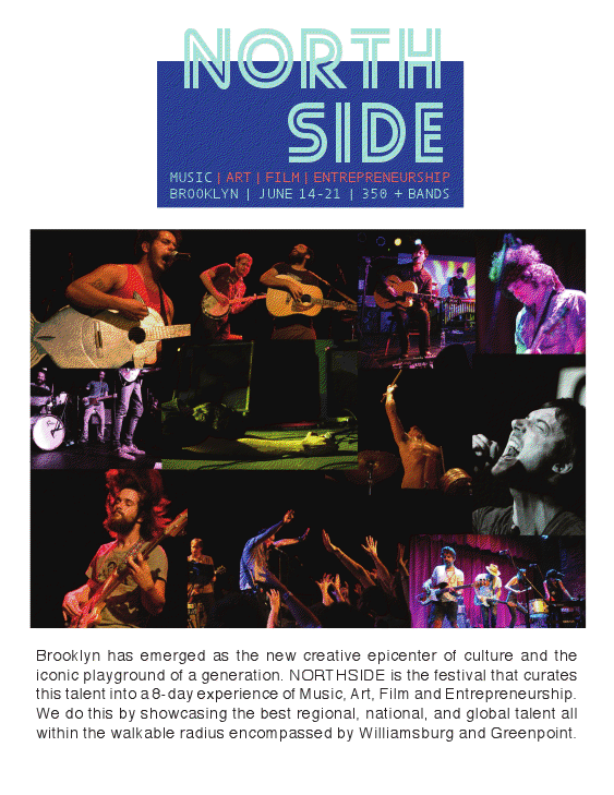 Northside Festival is NYC’s largest and most accessible discovery festival. Hundreds of bands, entrepreneurs, filmmakers, innovators, and over 80,000 fans converge on Brooklyn over eight days to witness the most incredible showcase of “what’s next” in music, film, entrepreneurship, and art.