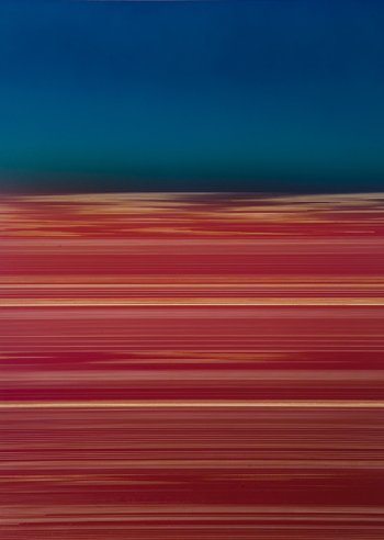 He tears off photograph’s surface very carefully with the tip of a knife following a ruler and creates a very thin horizontal line, much like the lines of a print. He starts at the left and ends at the right. He uses abstract photographs and erases instantaneously recognizable images by enlargement and throwing them out of focus. Much like the laser eye surgery, he controls the angle of a knife and the depth of digging and varies the intervals between the lines through the weakening and hardening of scratching. He produces several chromatic variations with rhythmic patterns and layers of the most unexpected color.