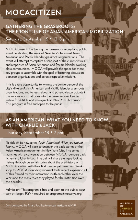 MOCA presents Gathering the Grassroots, a day-long public event celebrating the work of New York’s foremost Asian American and Pacific Islander grassroots organizations. The event will attempt to capture a snapshot of the current issues and responses of Asian American and Pacific Islander working class communities. MOCA will provide the space for these key groups to assemble with the goal of fostering discussion between organizations and across respective missions.