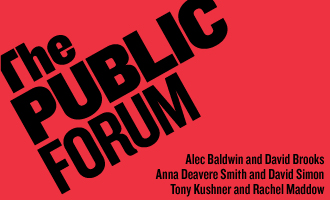 THE PUBLIC FORUM is a high-profile series of lectures, debates, and conversations inspired by plays in The Public Theater season. Curated by Jeremy McCarter, the Forum features leading voices in politics, media, and the arts. Alec Baldwin, Anne Hathaway, Cynthia Nixon, Michael Stuhlbarg, Sam Waterson, and NEA Chairman Rocco Landesman have hosted its programs, which have featured the insights of Kurt Andersen, Carl Bernstein, David Brooks, Arianna Huffington, Bill Irwin, Tony Kushner, Suzan-Lori Parks, Francine Prose, Stephen Sondheim, and young veterans of the war in Afghanistan – plus performances by Anne Hathaway, Michael Friedman, Gabriel Kahane, and Michael Ceveris, among others.