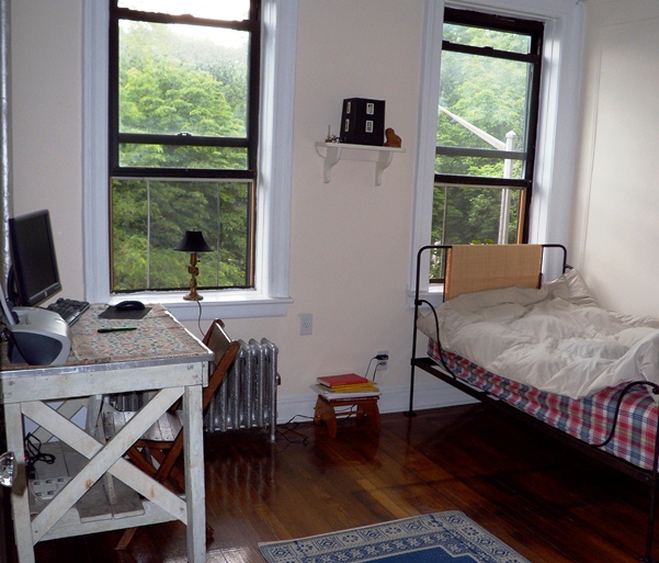 It has a twin bed, large closet, large desk with desk chair and a new upholstered sofa