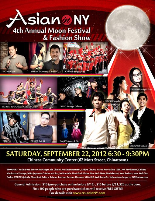 sianInNY (亞洲人在紐約) 是紐約首屈一指的跨多元文化 和娛樂的資訊分享平台,成立於2008年,每年必辦兩個節日慶祝會:新年和中秋。AsianInNY 將於今年2012年9月22日晚上從6:30到9:30在紐約唐人街中華公所62號勿街舉辦活動慶祝中秋節和紐約時裝週!