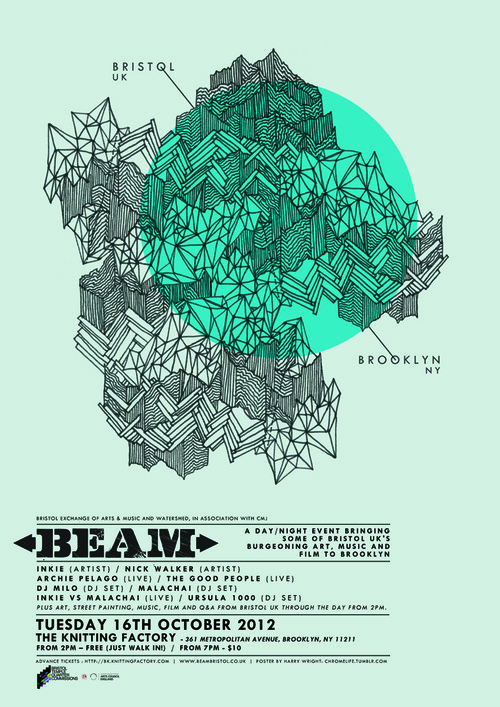 BEAM// (Bristol Exchange of Arts & Music) are bringing a slice of Bristol’s burgeoning street level art, music and film to Brooklyn. BEAM// will be running a day and night event at the Knitting Factory in Williamsburg, featuring world renowned street artists Inkie and Nick Walker, music from Scott Hendy (Malachai/Boca 45), plus the legendary Bristol DJ and long time NY resident DJ Milo. There will also be representation from Brooklyn in the form of DJ Ursula 1000 and live acts The Good People and Archie Pelago.