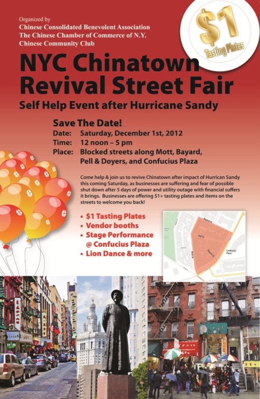 The Chinese Consolidated Benevolent Association (CCBA) and The Chinese Chamber of Commerce of New York (CCCNY) would like to invite you to a large-scale street fair on Saturday, December 1 2012, from noon through 5:00 PM. Throughout the past two weeks New York City was paralyzed by Hurricane Sandy. Businesses in Chinatown suffered significant losses and are still experiencing an economic crisis. Many small businesses were unable to continue with their normal routines due to the loss of power, water and heat. Following the hurricane, tourist population and consumption declined so drastically that Chinatown’s business operations descended to a ten-year low. Although New York State and City government offices have employed numerous resources and a large amount of manpower in attempts to rebuild New York City, we must also help ourselves to swiftly relieve and revive the economy in Chinatown. In order to recover from these straitened circumstances, we as Chinatown’s businesses must unite together and solve our problems collectively.