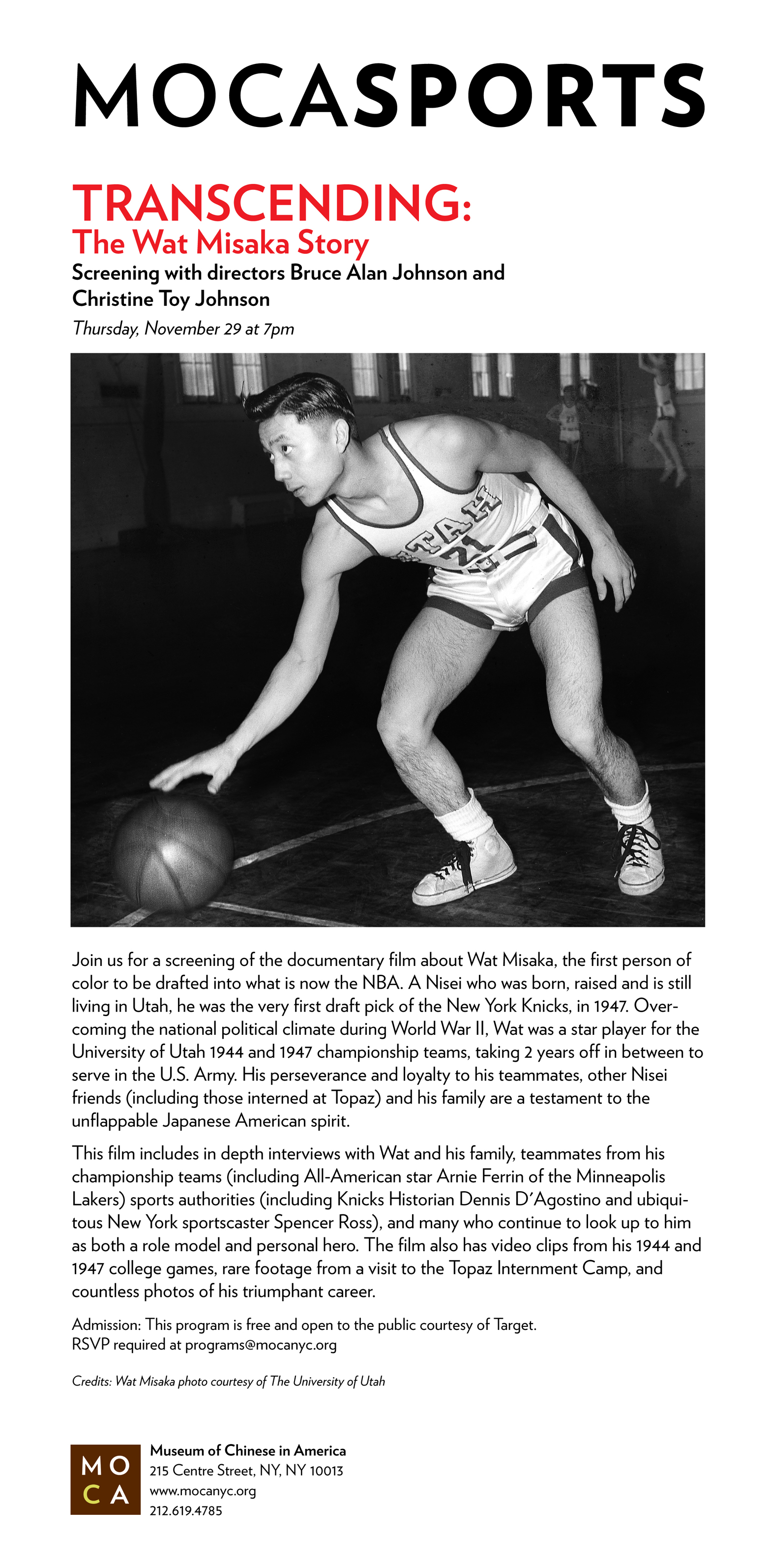 Film screening of “TRANSCENDING: The Wat Misaka Story” followed by a talk with directors Bruce Alan Johnson and Christine Toy Johnson.