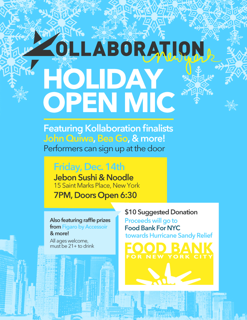 Join Kollaboration New York for a night of music to send support to Hurricane Sandy victims! Thousands of families lost their homes to Hurricane Sandy and many are still displaced and in need of help. $10 suggested donation; all proceeds will be donated to the Food Bank, New York’s major hunger-relief organization working to end food poverty throughout the five boroughs. Come enjoy live music (featuring John Quiwa & Bea Go), an evening out with friends, raffle prizes from Accessoir and more as we work together to send Hurricane Sandy victims warm meals for the coming holidays!