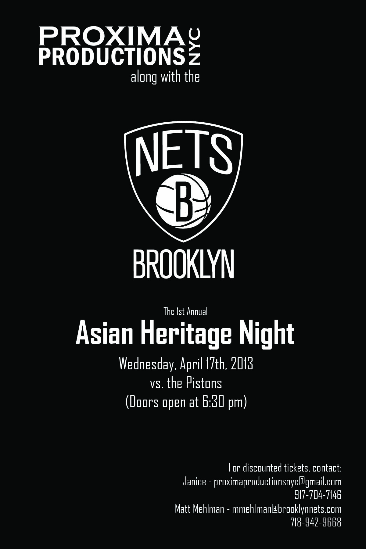 Proxima Productions NYC will team up with The Brooklyn Nets to host the first annual Asian Heritage Night on Wednesday, April 17th, 2013 when the Nets take on the Detroit Pistons in their final game of the regular season. The Nets will celebrate the Asian Community with a pre-game showcase of the diverse cultures from all over the continent of Asia. In addition, we will recognize some of the prominent members of the Asian-American Community in New York City.