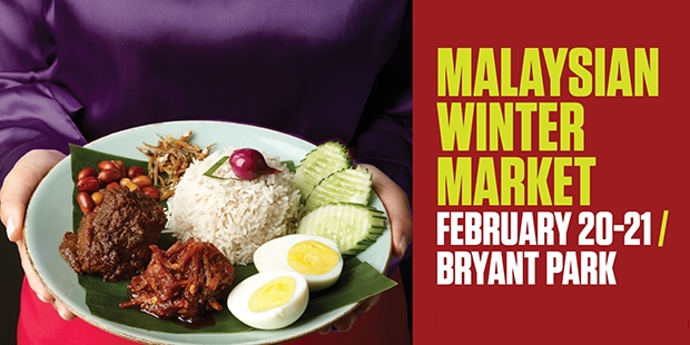 On February 20 – 21, 2013 Malaysia Kitchen for the World will host The Malaysian Winter Market at Bryant Park’s Fountain Terrace, featuring a variety of signature Malaysian dishes and traditional Malaysian food products by restaurants and vendors in New York City and the Tri-State area. The event will be held in the heart of Bryant Park, under large, stunning heated tents near the iconic Bryant Park fountain and skating rink, surrounded by colorful umbrellas and lanterns reminiscent of the street markets of Kuala Lumpur and Penang. The Malaysian Winter Market will be open all day, but be sure to stop by for lunch and dinner on both February 20 & 21 for great Malaysian dishes for up to $8 each: