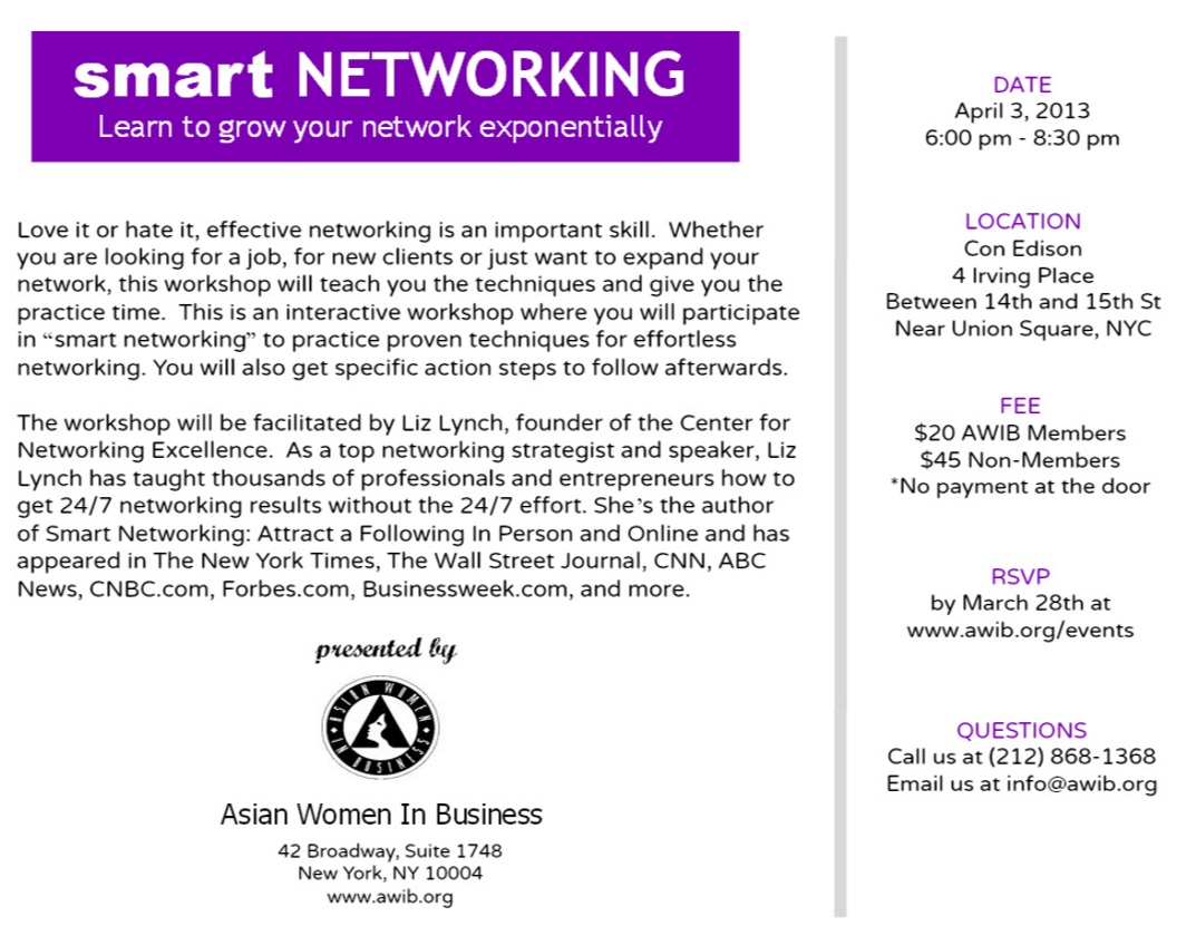 The workshop will be facilitated by Liz Lynch, founder of the Center for Networking Excellence. As a top networking strategist and speaker, Liz Lynch has taught thousands of professionals and entrepreneurs how to get 24/7 networking results without the 24/7 effort. She’s the author of Smart Networking: Attract a Following In Person and Online and has appeared in The New York Times, The Wall Street Journal, CNN, ABC News, Fox Business News, CNBC.com, Forbes.com and Businessweek.com.