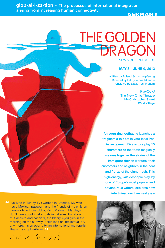 Written by one of Europe’s most celebrated living playwrights, Roland Schimmelpfennig (Arabian Night, Peggy Pickit Sees the Face of God), and presented here by The Play Company, The Golden Dragon makes its New York debut under the direction of Ed Sylvanus Iskandar (These Seven Sicknesses), acclaimed for his immersive and whimsical invitation-only theater company, Exit Pursued by a Bear.