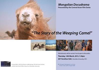 Join Columbia University’s Oasies Central Asian Film Series, The Harriman Institute, and the Asia Pacific Affairs Council on, Thursday, 14th March at 7.30pm for a screening of the docudrama (staged documentary film) The Story of the Weeping Camel in 607 Hamilton Hall (6th floor), on Columbia University’s Morningside Heights campus.