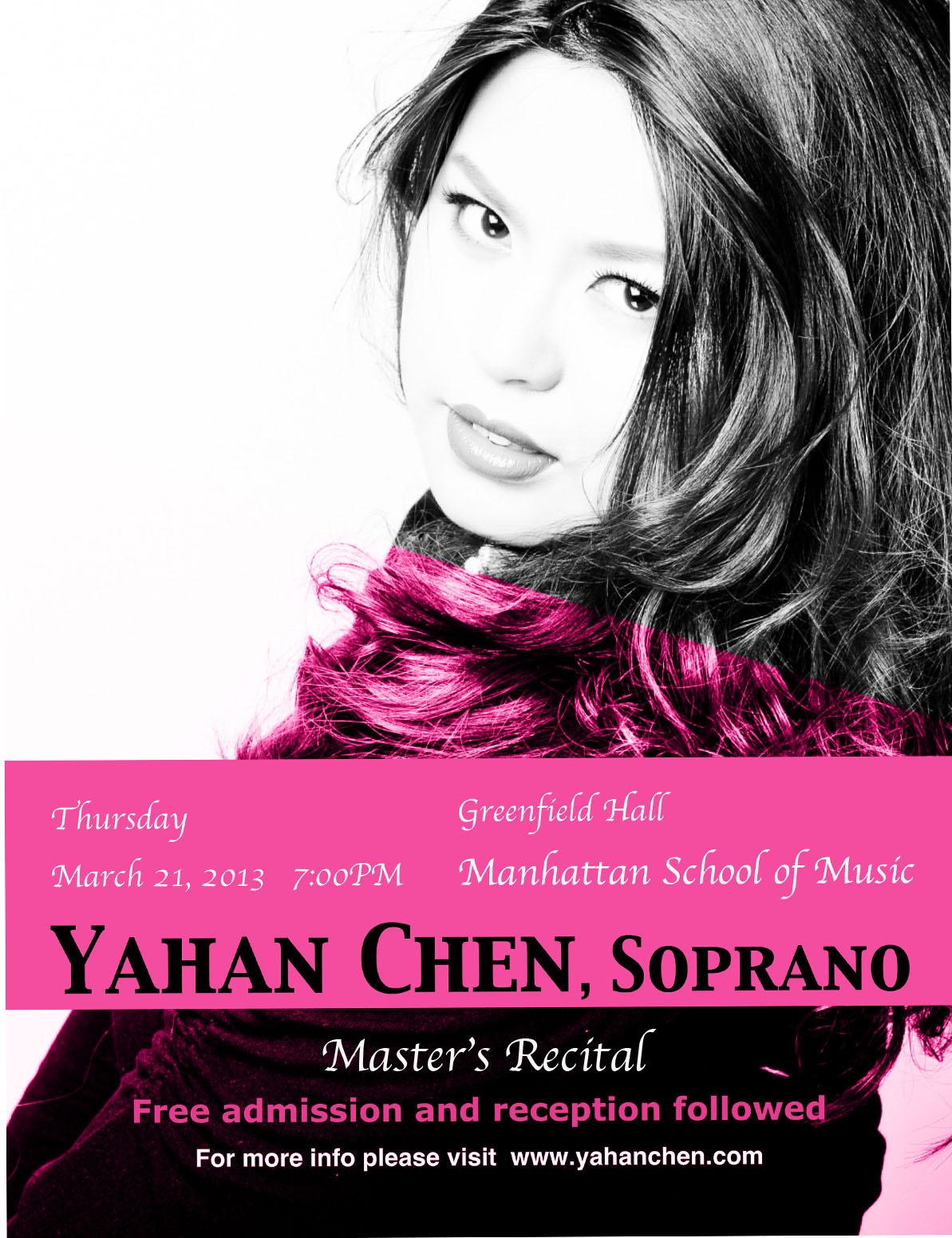 Yahan Chen, Soprano. Studying in Manhattan School of Music. Come and celebrate her Master’s graduation recital.
