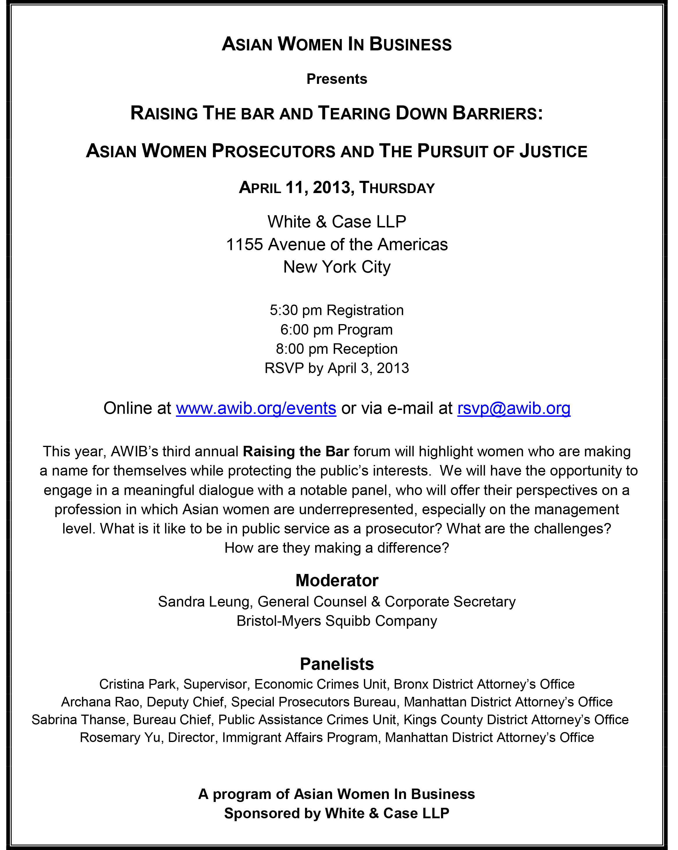 This year, AWIB’s third annual Raising the Bar forum will highlight women who are making a name for themselves while protecting the public’s interests. We will have the opportunity to engage in a meaningful dialogue with a notable panel, who will offer their perspectives on a profession in which Asian women are underrepresented, especially on the management level. What is it like to be in public service as a prosecutor? What are the challenges? How are they making a difference?