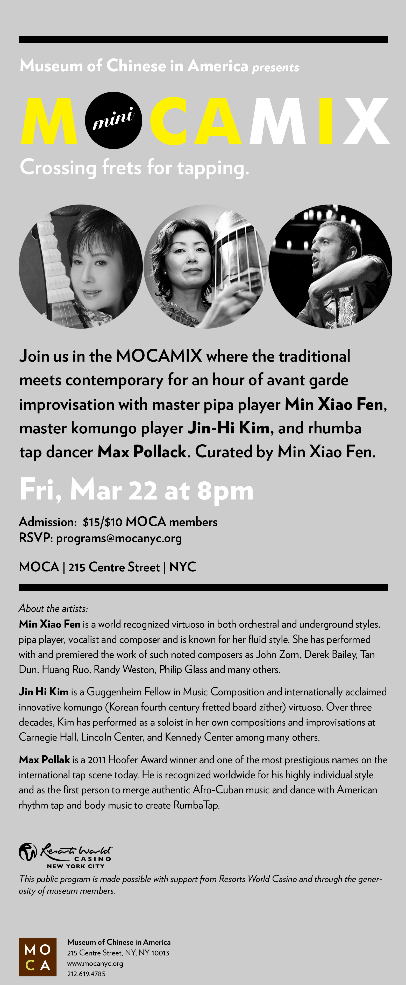 Join us for our third installment of MOCAMIX– live improvisation between contemporary and traditional musicians, singers, and dancers. Up next: Min Xiao Fen (pipa), Jin Hi Kim (komungo), with Max Pollack (rhumba tap).