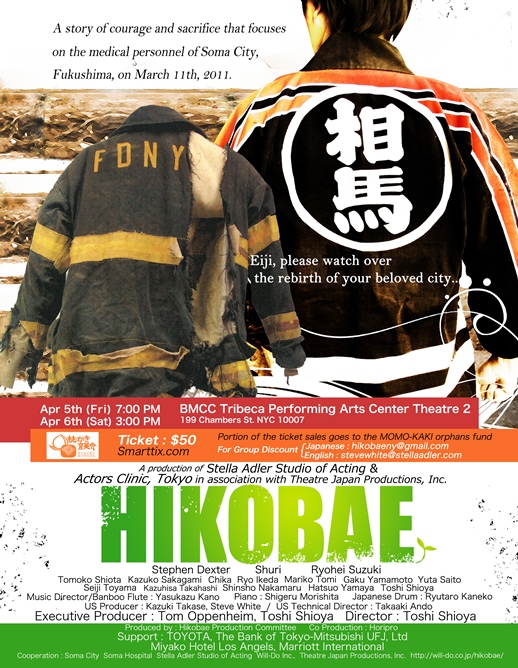 Hikobae is a fictionalized story based on recorded interviews with physicians and nurses from Soma City Hospital, a medical center in the Fukushima evacuation zone. The play is part of an ongoing international collaboration between New York’s Stella Adler Studio of Acting and The Actors Clinic, a prominent acting school in Tokyo led by Toshi Shioya. Graduates from both acting schools are participating in the production.