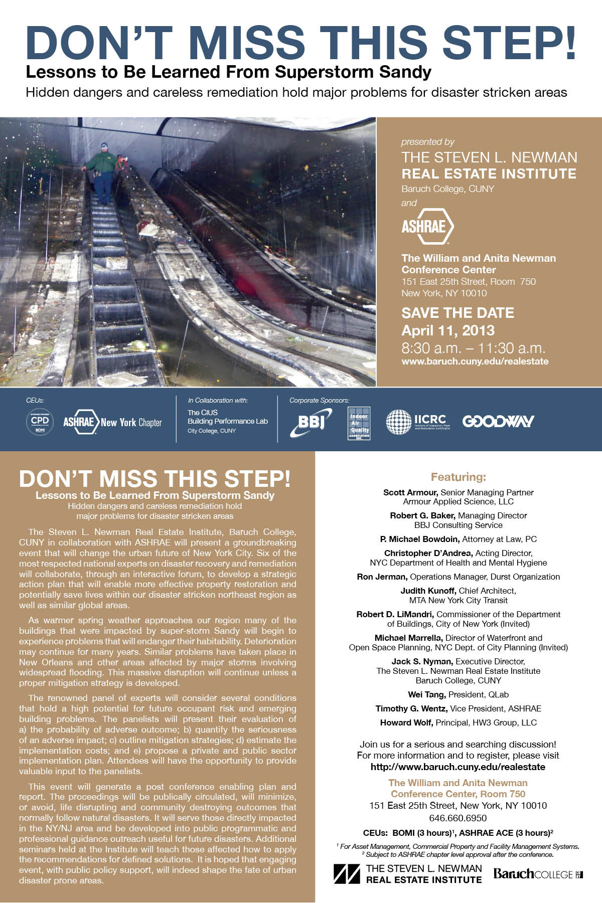 The Steven L. Newman Real Estate Institute, Baruch College, CUNY in collaboration with ASHRAE will present a groundbreaking event that will change the urban future of New York City. Six of the most respected national experts on disaster recovery and remediation will collaborate, through an interactive forum, to develop a strategic action plan that will enable more effective property restoration and potentially save lives within our disaster stricken northeast region as well as similar global areas.