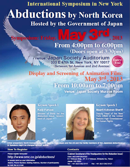 On May 3rd, the Japanese Government (Headquarter for Abduction Issue, Cabinet Office) will hold Symposium and Panel Display at the Japan Society on the issue of abduction by North Korea, as follows.