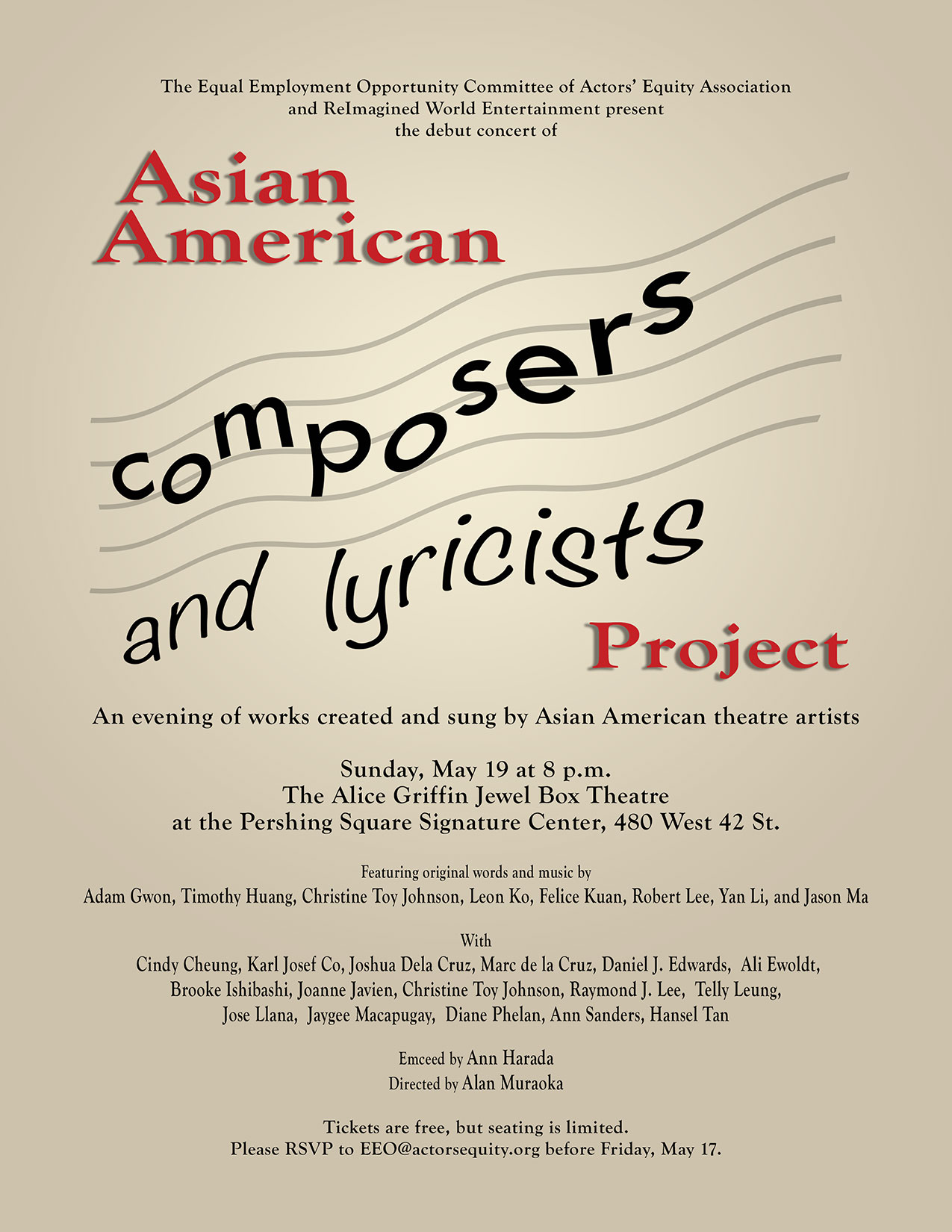 In celebration of Asian Heritage month, the Equal Employment Opportunity (EEO) Committee of AEA ReImagined World Entertainment will present the debut of “The Asian American Composers and Lyricists Project,” an evening of works created and sung by Asian American theatre artists.