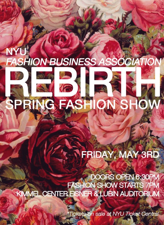 Come join NYU FBA for our Annual Spring Fashion Show. This year’s show is “REBIRTH”.