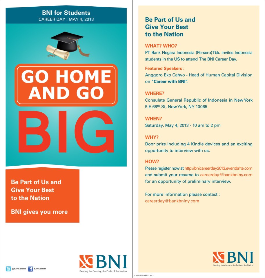 BNI invites all Indonesian students and professionals who are looking to expand their line of work within the financial sector. If this event appeals to you then make sure to clear your calendar for May 4th, 2013 from 10.00AM – 2.00PM at the Consulate General of the Republic of Indonesia (5 East 68th Street New York, NY 10065).