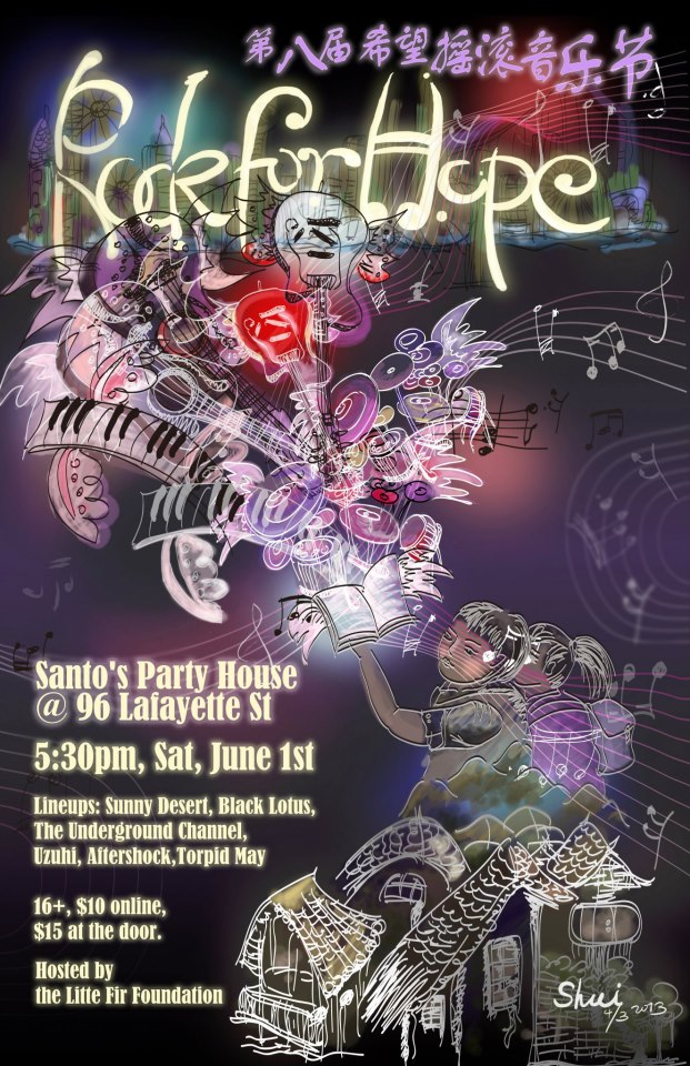 The “Rock for Hope” benefit concert by the Little Fir Foundation and with the special support from Barclays, has established its presence as an ongoing series increasingly embraced by the NYC indie-rock community. Taking place every few months at various live music venues, the “Rock for Hope” series is pleased to present its next charity event–“Rock for Hope VIII” at 6:00 PM on Saturday, June 1, at the Santos Party House, TriBeCa.