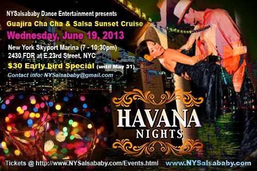 NYSalsababy Dance & LSDance Entertainment presents “HAVANA NIGHT SUNSET CRUISE”, an All-White Guajira Cha Cha & Salsa Boat Affair. 3-hour boat ride includes catered dinner, 2 floors of dancing, dance lesson, sizzling dance performances, stand-up comedy, gift raffles & free giveaways. WANNA RIDE FOR FREE?
