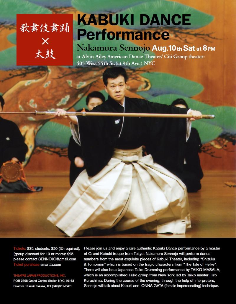 A rare opportunity to view an authentic Kabuki Dance performance by master Nakamura Sennojo from Japan. NYCCC students will receive a $15/tkt special. To receive this special offer, please RSVP to info@chinesedance.org by Thursday August 8th.