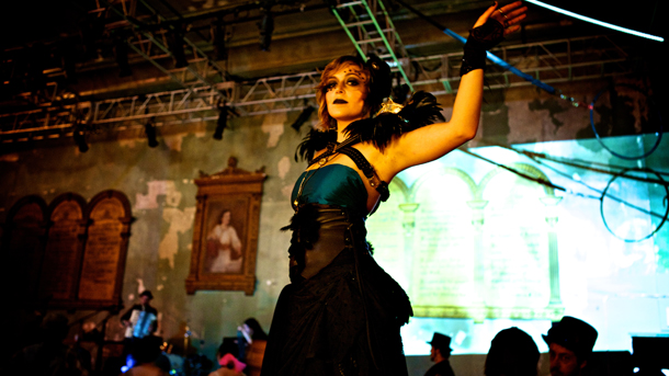 Springing from San Francisco’s circus underground, Vau de Vire Society includes classically trained dancers, acrobats, aerial artists, contortionists, circus sideshow acts, fire performers, and saucy cabaret go-gos. Belles of the annual steampunk Edwardian Ball, the “avant-cabaret community” awes and titillates with just the right amount of glitter and hot antics.
