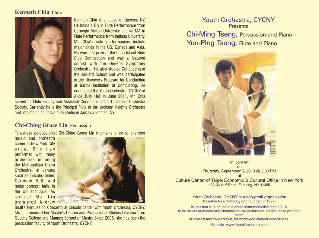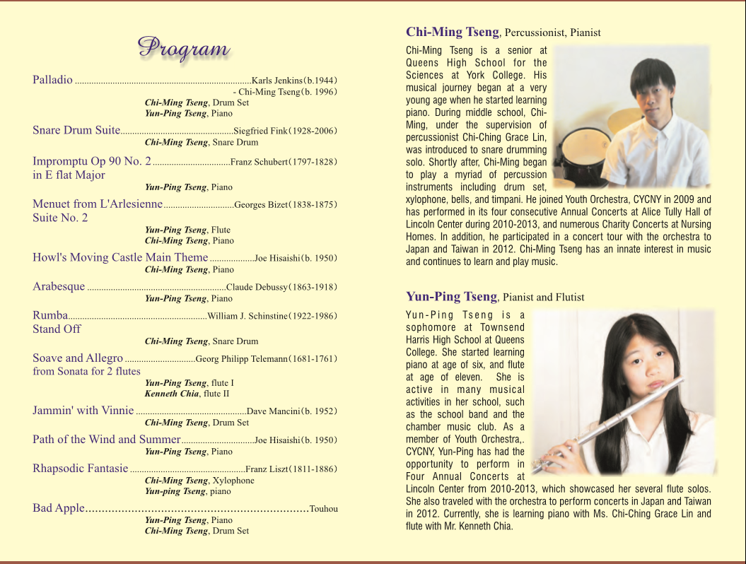 Yun-Ping Tseng is a sophomore at Townsend Harris high school at Queens College. As a member of Youth Orchestral, CUCNY, she got a chance to perform in Four Annual Concerts at Lincoln Center from 2010-2012, which showcased her several flute solos. She also traveled with the orchestra to perform concerts in Japan and Taiwan in 2012. Currently, she is learning piano with Ms. Chi-Ching Grace Lin and flute with Mr. Kenneth Chia.
