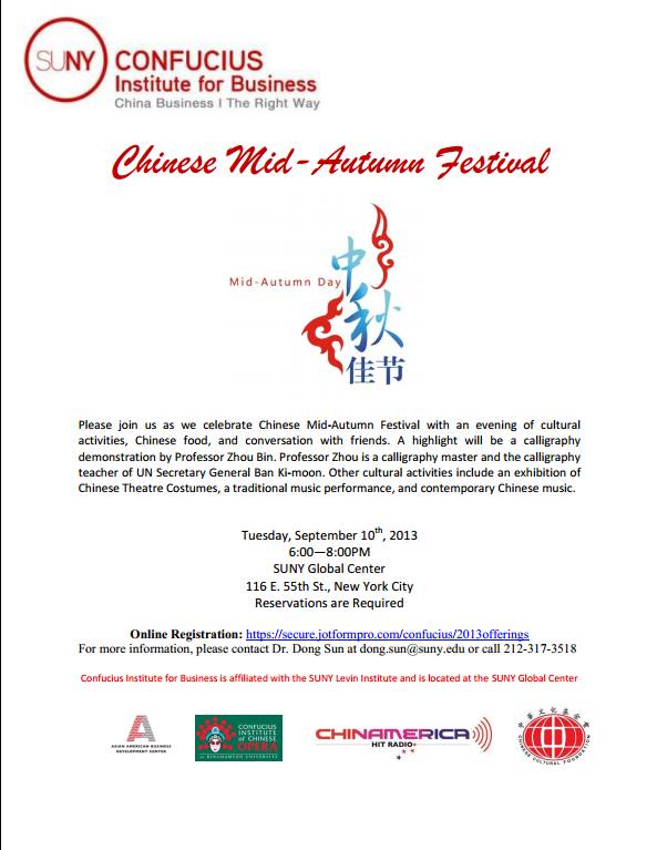 Please join us as we celebrate Chinese Mid-Autumn Festival with an evening of cultural activities, Chinese food, and conversation with friends. A highlight will be a calligraphy demonstration by Professor Zhou Bin. Professor Zhou is a calligraphy master and the calligraphy teacher of UN Secretary General Ban Ki-moon. Other cultural activities include an exhibition of Chinese Theatre Costumes, a traditional music performance, and contemporary Chinese music.