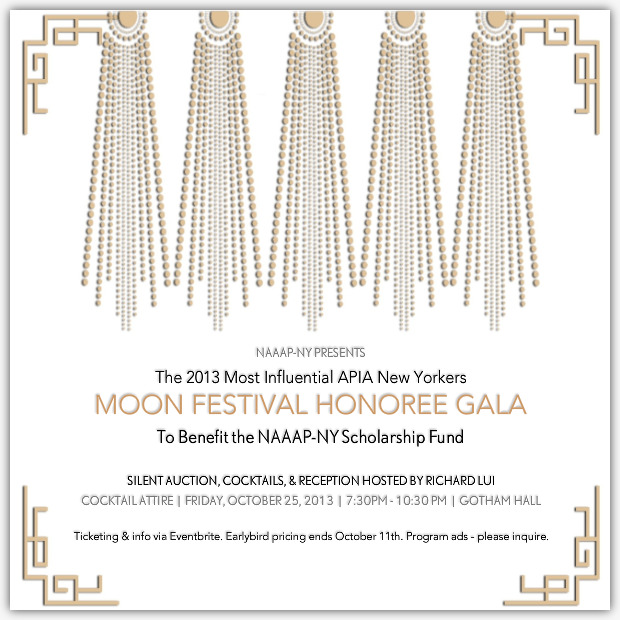You are cordially invited to join NAAAP-NY on Friday Oct. 25th for the Moon Festival Honoree Gala. This milestone event will be the first of its kind in New York City as the evening is a celebration of not only the Honorees of New York’s Most Influential APIAs, but also of achievements of the city’s entire Asian American community.