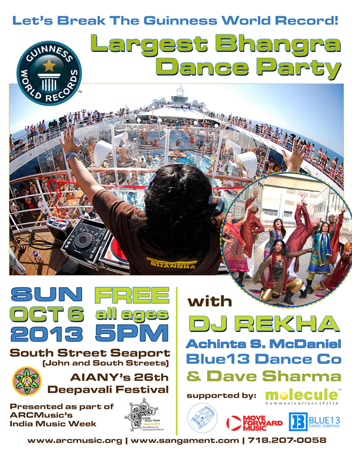 DJ Rekha, Achinta S. McDaniel/Blue13 Dance Company, and Dave Sharma will lead a crowd of thousands to break the Guinness World Record for Largest Bhangra Dance at South Street Seaport during Association of Indians in America annual Deepavali Festival. This is the inaugural event of India Music Week presented by Archive of Contemporar