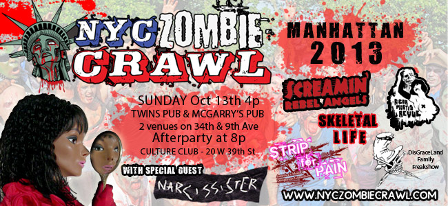 The NYC Zombie Crawl is back for its 7th annual lurch around Manhattan on Sunday, October 13th! Expect the usual zombie shenanigans sponsored by Pabst Blue Ribbon with great drink specials! This year we’re heading uptown with a crawl through Times Square and an afterparty for NY Comic Con! The party starts at 4pm only three blocks from Comic Con and will all culminate in a blood fueled after party at Providence (311 W 57th St btwn 8th and 9th ave) at 8:30pm with the ‘Night of the Stripping Dead’ stage show featuring some of the hottest undead burlesque performers in the world as well as live music, sideshow performances and more!