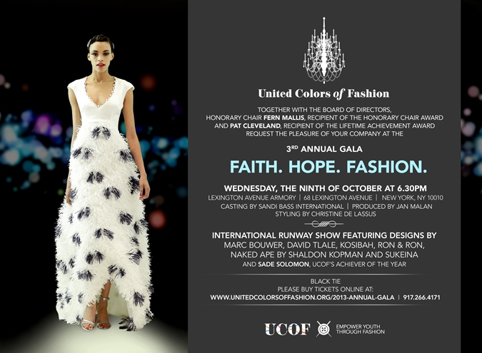 Our Annual Gala is the most exciting time of the year for United Colors of Fashion as we celebrate the last year and recognize exceptional individuals for their contributions philanthropically and to the arts. UCOF is excited to present our third international runway show featuring seven renowned designers from around the world, including Marc Bouwer (South Africa), David Tlale (South Africa), Naked Ape by Shaldon Kopman (South Africa), Ron & Ron (Haiti/USA), Kosibah by Yemi Osunkoya (United Kingdom), Sukeina (USA) and Carmen Marc Valvo (USA). Jan Malan is our show’s Producer, Sandi Bass is our Casting Director and Christine De Lassus is our Stylist. We are also extremely proud to showcase the first collection of our top fashion student and Achiever of the Year, Sade Solomon, in a fashion exhibition. Fern Mallis, fashion industry leader and the renowned creator of New York Fashion Week, is the Honorary Chair for the event. Legendary supermodel Pat Cleveland, who walked the runway for UCOF’s gala last year and has made invaluable contributions to the worlds of fashion and the arts, will be honored with the 2013 Lifetime Achievement Award. We are also proud to have Devyn, winner of “THE FACE” modeling reality show, as our gala’s International Fashion Ambassador. The night will also feature a dance presentation by Steps on Broadway as well as the opportunity to put on your own dancing shoes as the dance floor opens with our gala DJ.