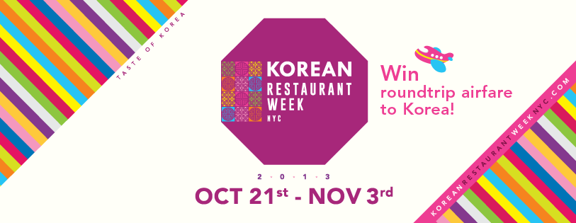 Korean Restaurant week starts!! Please go and taste Korean food. Visit any participating restaurants during Korean Restaurant Week NYC (October 21 – November 3). Take a photo and tag @KoreanRestaurantWeekNYC or #KoreanRestaurantWeekNYC on Facebook, Instagram, and Twitter to get a roundtrip ticket to South Korea!