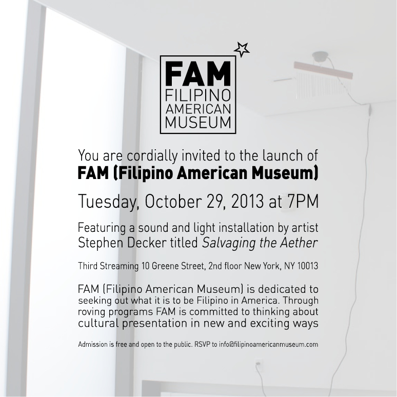 To kick off the founding of FAM, the public is invited to participate in a one-night event: a new sound and light performance by Queens-based, Filipino American artist Stephen Decker.