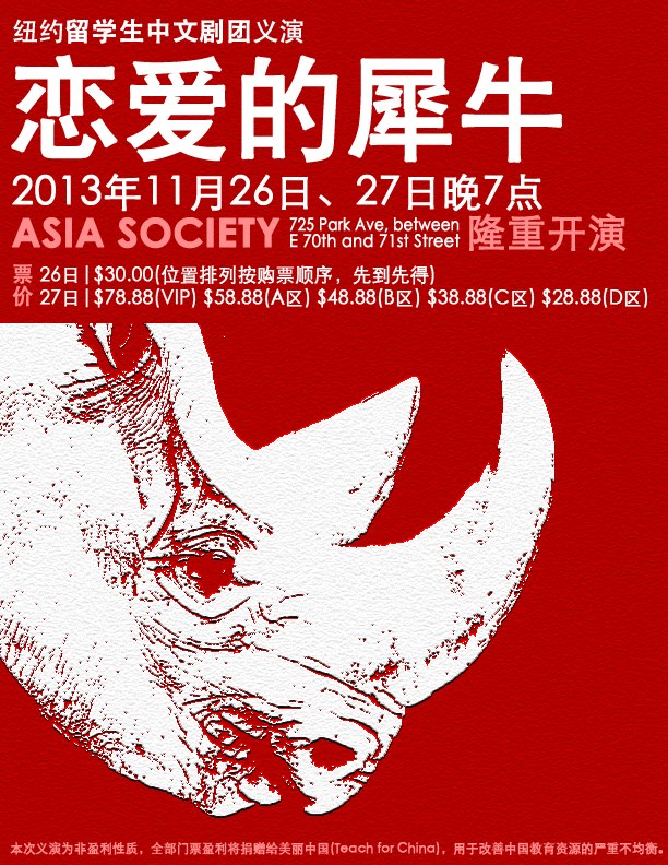 A group of international students in New York is going to act a famous drama called “Rhinoceros in love”. The profit of this performance will be donated to “Teach for China” in order to improve the severe unequal educational resource distribution of China.