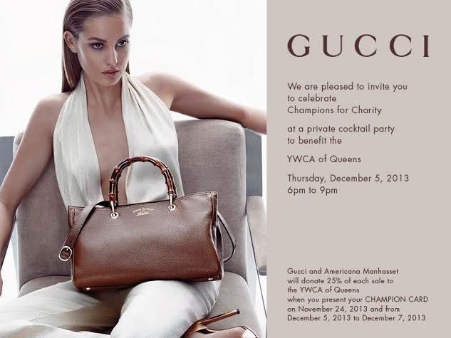 Americana Manhasset will donate 25% of all purchases to the YWCA of Queens to anyone who presents their Champions Card while shopping. Champions Cards can be acquired during the cocktail party launch at GUCCI. If you miss the launch, you can still get the card at any time during the 3-day Champions for Charity event, which will run December 5th through December 7th, 2013.