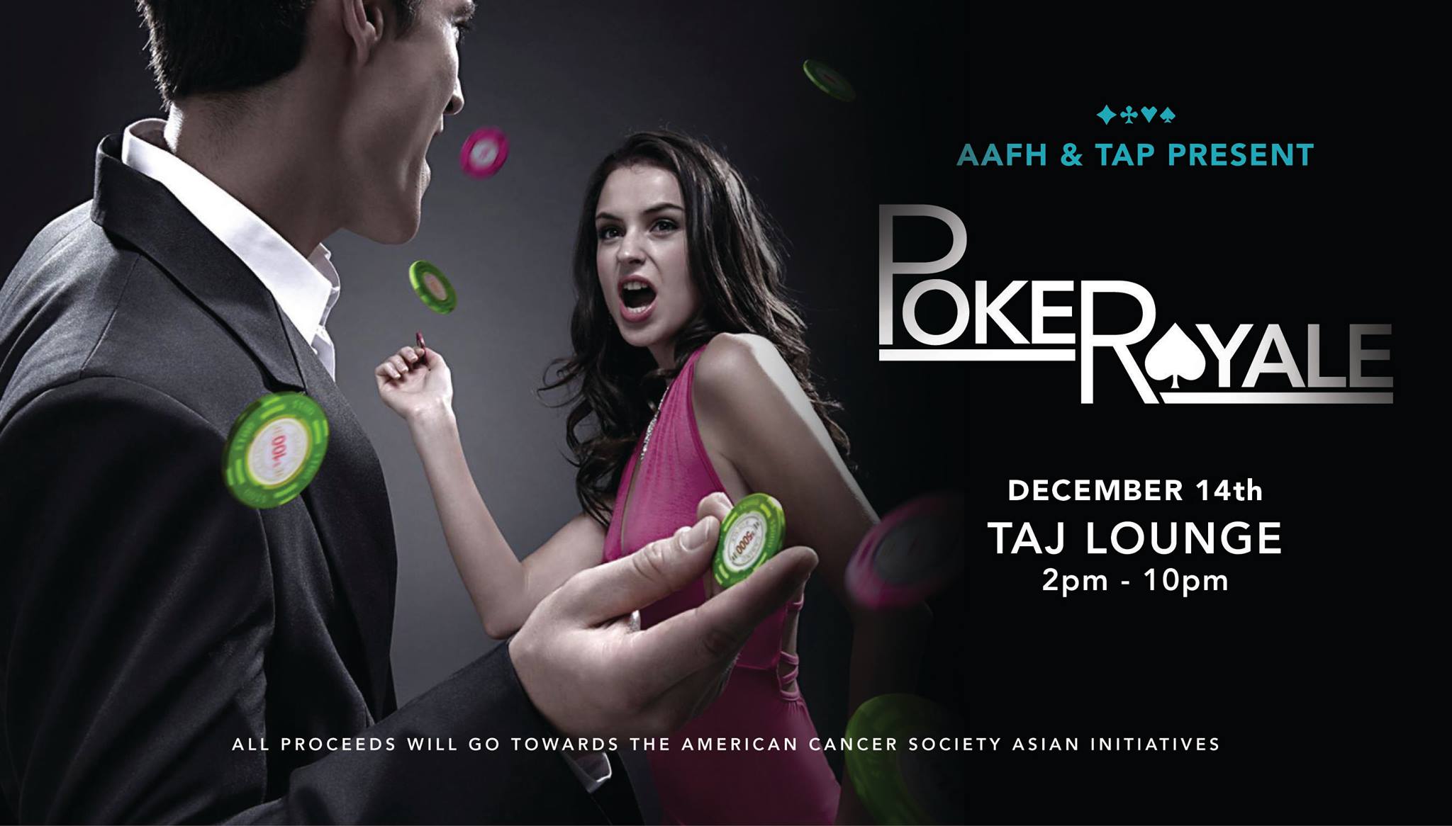 Ladies and Gentlemen, on behalf of Asian Americans for Hope (AAFH) and Taiwanese American Professionals (TAP), we cordially invite you to “POKER ROYALE,” a charity poker tournament benefitting the American Cancer Society (ACS). There are many prizes to win, including a Playstation 4 and the right to win Google Glass!